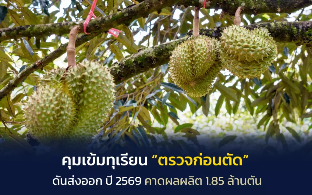 อ่านเพิ่มเติม 🡥คุมเข้มทุเรียน “ตรวจก่อนตัด” ดันส่งออก ปี 2569 คาดผลผลิต 1.85 ล้านตัน
